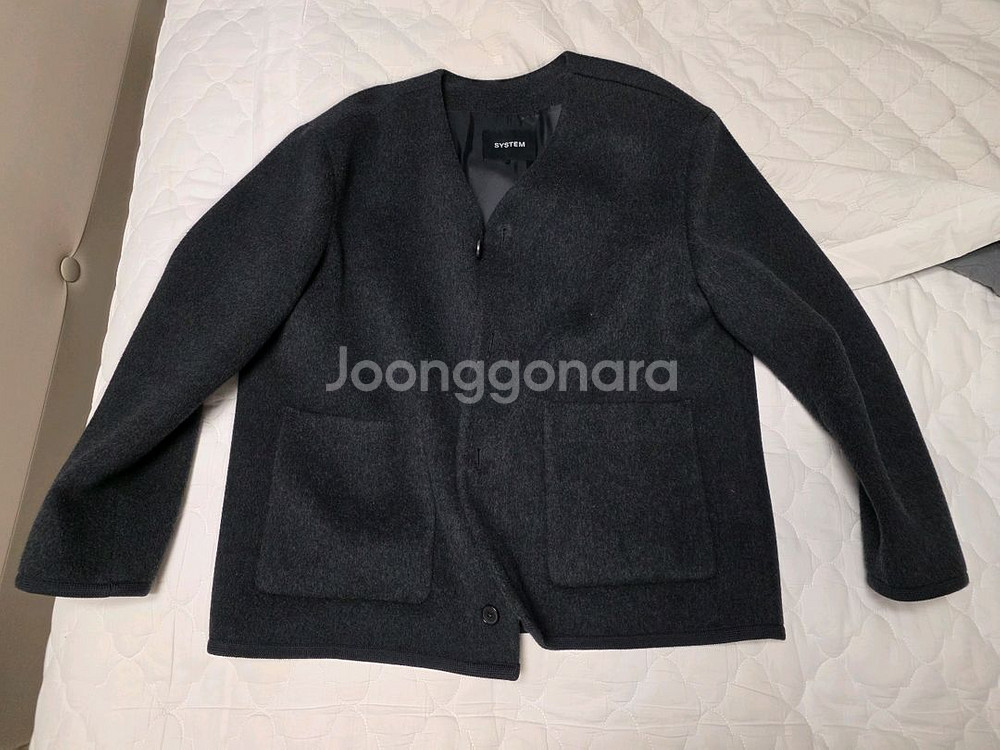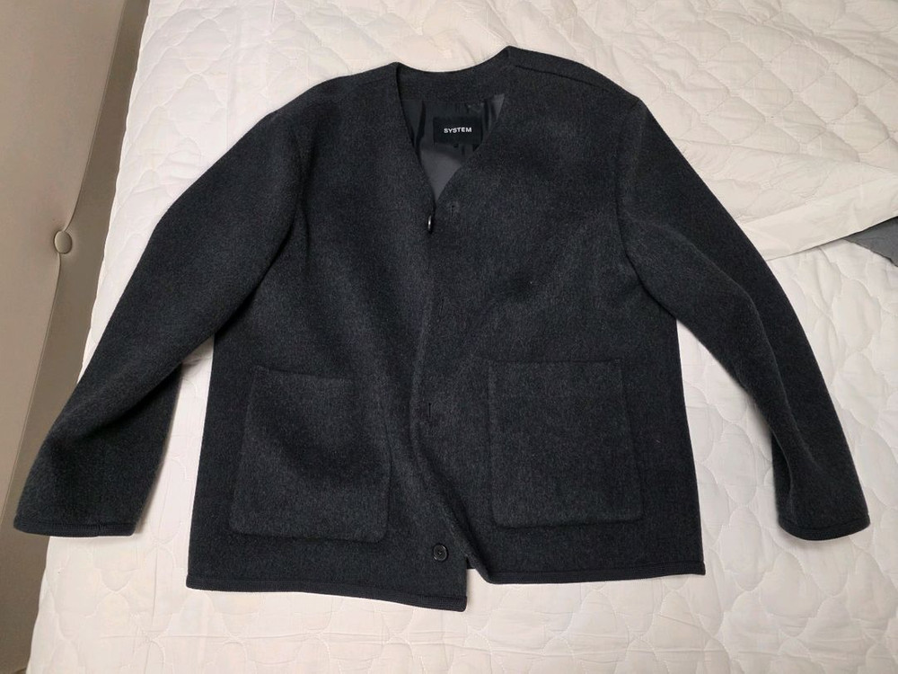 시스템 회색 자켓입니다 - 사이즈: 100 재질은 캐시미어 5%, 모 95% 혼방입니다 2회 착용으로 사용감 없습니다