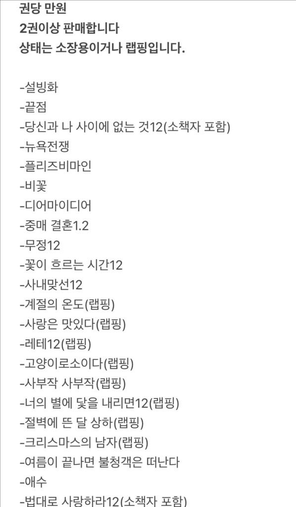 로맨스소설 로판 권당 만원 판매합니다 두권이상 판매 소장용이거나 랩핑 섞여있습니다:) 안전 결제시 결제창 만들어드려요. -설빙화 -끝점 -당신과 나 사이에 없는 것12(소책자 포함) -뉴욕전쟁(랩핑) -플리즈비마인 -비꽃 -디어마이디어 -중매 결혼1.2 -무정12 -꽃이 흐르는 시간12 -사내맞선12 -계절의 온도(랩핑) -사랑은 맛있다(랩핑) -레테12(랩핑) -고양이로소이다(랩핑) -사부작 사부작(랩핑) -너의 별에 닻을 내리면12(랩핑) -절벽에 뜬 달 상하(랩핑) -크리스마스의 남자(랩핑) -여름이 끝나면 불청객은 떠난다 -애수 -법대로 사랑하라12(소책자 포함) -빛으로 물들다 12 -그토록 아름다운 여름 -봄 거짓말 -사랑도 아니면서 -길티 -파반느 12