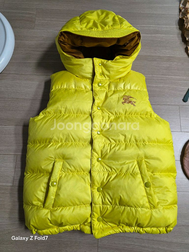 버버리 키즈 양면 후드 패딩 조끼입니다 겉은 브라운, 안은 노란색입니다 상태 좋습니다 몇번안입혔어요 140cm 10y입니다. 오리털빵빵해요.