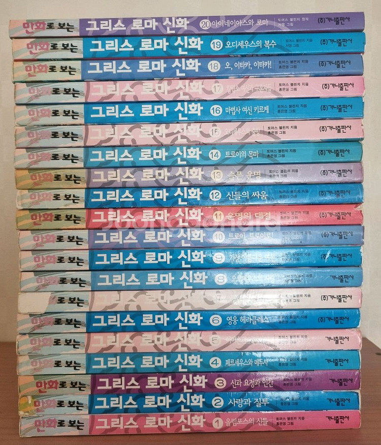 홍은영 만화로보는그리스로마신화 1~18 홍은영 19,20 서영 그림 노출되는부분은 사진처럼 세월감 보입니다 3권정도 기둥 테이핑 1권 빨간내지에 이름 지운흔적 그외는 내지 갈라지거나 낙서등 하자는 없습니다. 다만 놓친부분은 있을 수 있으니 감안은 해주세요