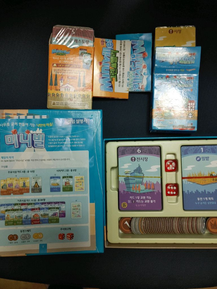 미니빌 기본판, 항구판, 그린 밸리. 확장판까지 3개입니다. 구성품 다 있습니다. 상태 전반적으로 깨끗하며 항구판, 그린 밸리는 카드의 반만 개봉했습니다.