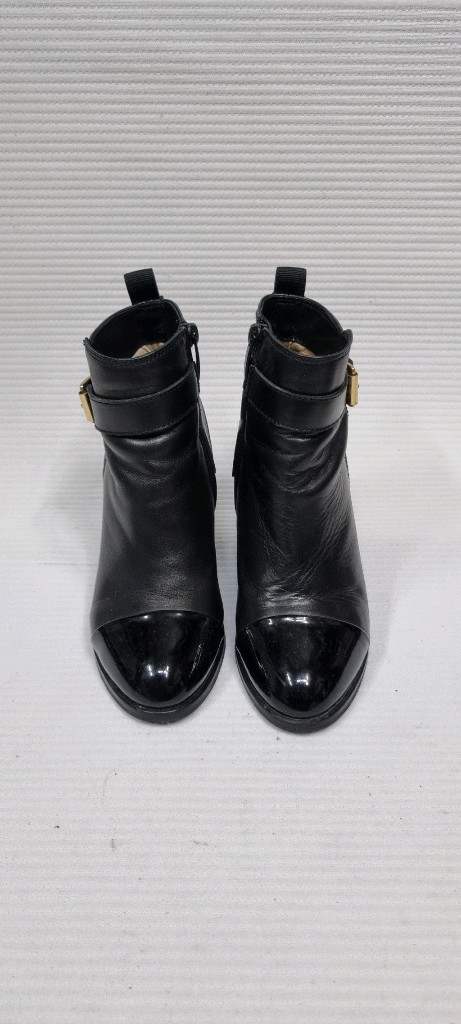 슈콤마보니 235사이즈 앵클 부츠입니다. 앞코는 유광 포인트 나머지는 무광 소가죽으로 되어있습니다. 옆에 금색 버클이 포인트로 달려있습니다. 옆지퍼로 신고 벗기 편해요. 별도 문의 없으시면 바로 안전결제 부탁드려요! 굽8cm정도로 살짝 높지만 착화감 편해요. 바닥사용감 있지만 상태좋아요. 교환 반품안되니 쿨거래 원해요. 택배비는 3500원 있어요.