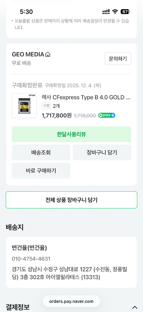 렉사 CFexpress Type B 4.0 골드 1TB 고성능 메모리카드입니다. 전문가용으로 제작된 고속 데이터 전송을 지원하는 제품이에요. 상태 양호하고 정상 작동 확인했습니다. 1달 넘게 사용하다가 카메라 중고로 넘겨서 메모리 카드만 판매합니다 1개 650000원 2개 1200000원