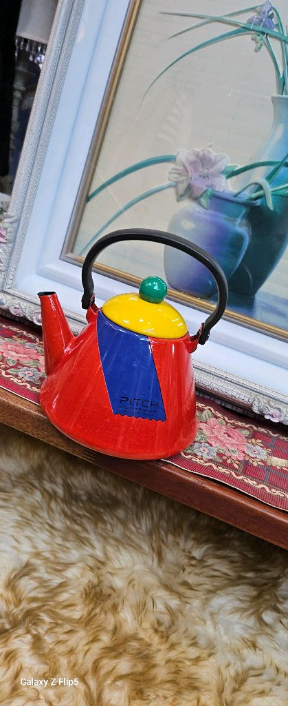 아이들이 좋아할 예쁜 컬러풀한 주전자예요. 레드 베이스에 노랑, 파랑, 그린 포인트가 들어가 있어서 너무 귀여워요. 상태 양호하고 실용적으로 사용하기 좋습니다.