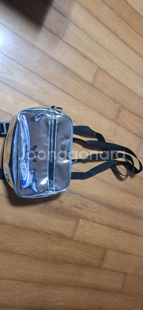 아디다스 스타일의 실버 컬러 웨이스트백이에요. 블랙 스트랩으로 포인트를 준 디자인이고, 상태는 양호한 편입니다. 구입가10만원