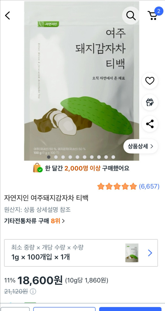자연지인 여주돼지감자차 티백 100개입 2봉