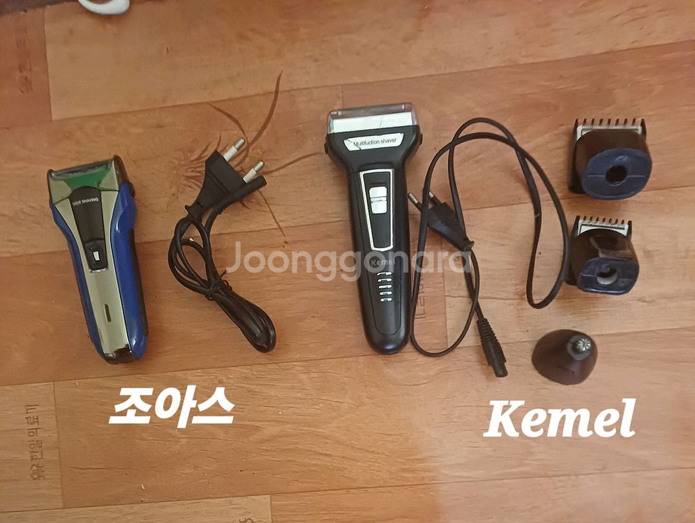 조아스.케미전기면도기 코털제거.바리깡2개포함된 면도기 [사용 안했음]충전 케이블과 함께 구성되어 있고, 사용감은 있지만 작동 상태 양호