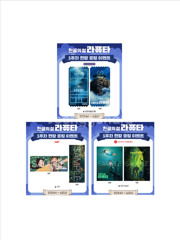 ❤️ [예약 및 상시 판매] 예약 오픈 런/미 수령시, 전액 환불 구매 취소 및 환불 불가 ❤️ GS25/CU 반값택배 2500원 자택 수령하는 일반택배 4500원 포스터 펼쳐서 A3 박스에 받으려면,CU반값/일반택배(박스 추가 비용 없음) [천공의성 라퓨타](합배송 가능) 오리지널티켓-11000원 TTT-11000원 아트카드-13000원 광음시네마 포스터+라퓨타 포토카드-30000원 티저 포스터+라퓨타 포토카드-15000원