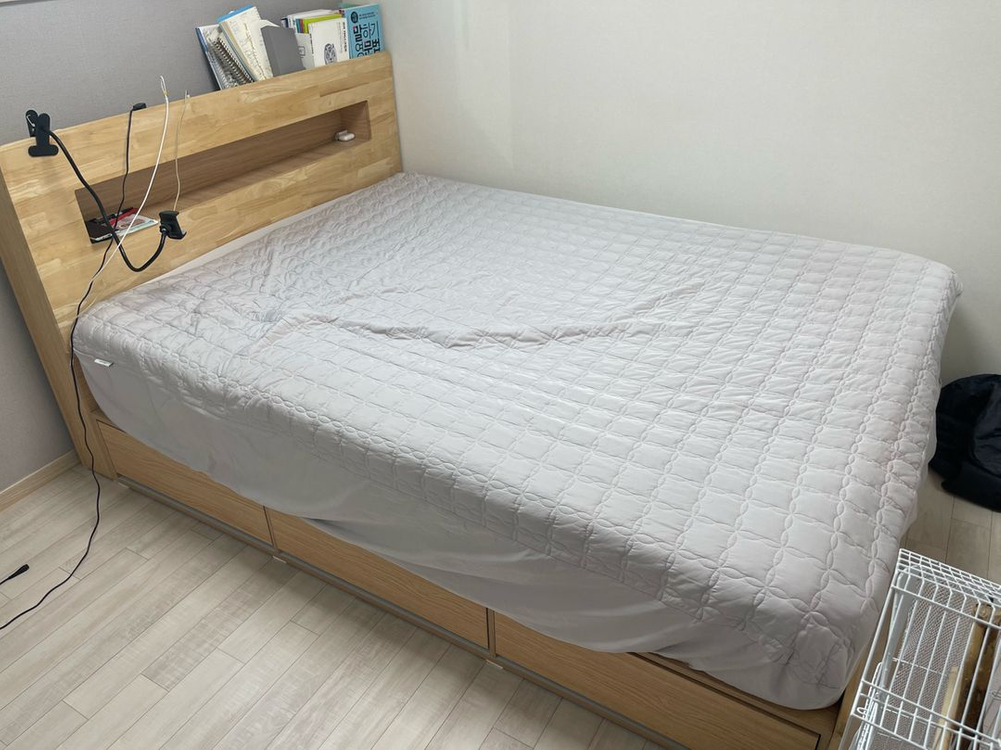 3년전쯤 60정도에 구매했고 매트리스는 커버 씌워 사용, 프레임에는 생활기스도 거의 없습니다 분해하면서 서랍쪽 까짐이 생겼네요 헤드쪽 수납있고 렘프랑 콘센트달려있고 침대하단에 수납공간 많습니다 거의 새거같아요 퀸사이즈이며 프레임 매트 포함 10에 팝니다 운반은 구매자분이 하셔야 합니다 공일0 2공공1 83육삼