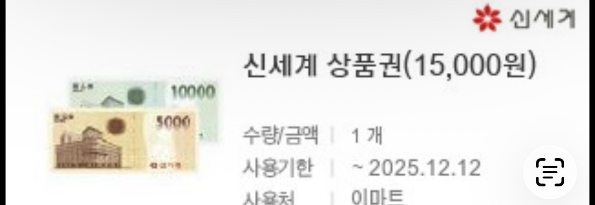 신세계 상품권 15,000원권 1장입니다. 사용기한은 2025년 2월 12일이라 넉넉해요. 이마트에서 교환가늠하십니다