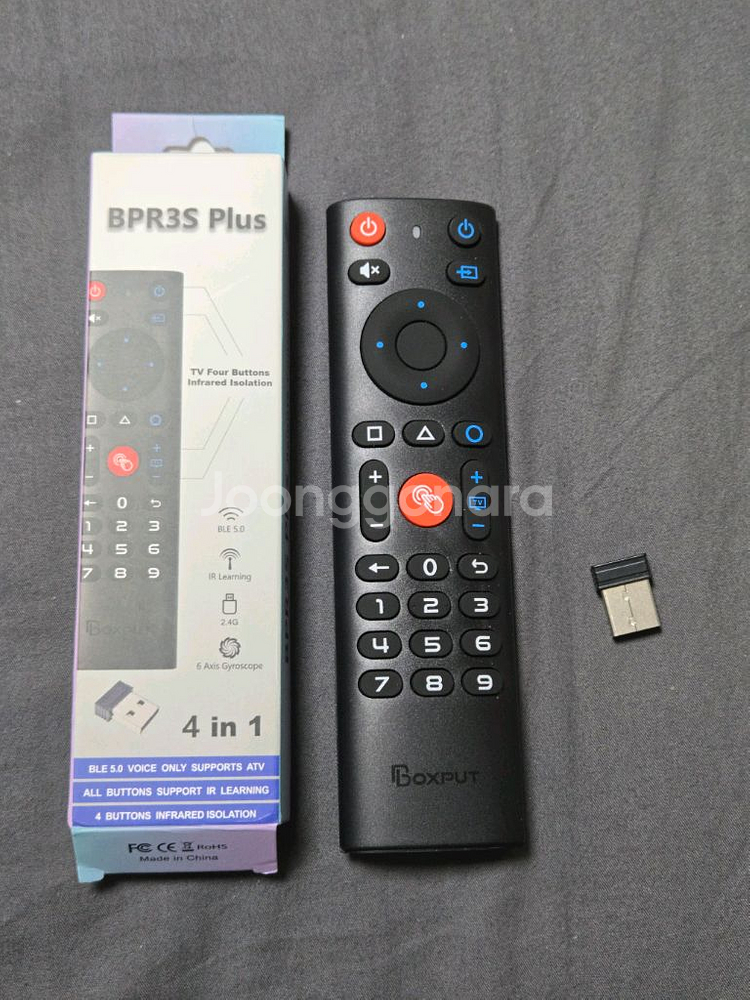 스마트 리모컨 새제품이고 안드로이드 TV/탭 등에서 사용하기 좋아요. (윈도우도 사용 가능) - 제품명 : Boxput BPR3S Plus - 연결방식 : 블루투스 5.0 또는 2.4GHz 동글 - 에어 마우스 (6 Axis Gyroscope) - 블루투스 연결시 구글 음성입력지원 가능 - IR 학습 기능 지원 (전원, 외부입력, 채널 등)