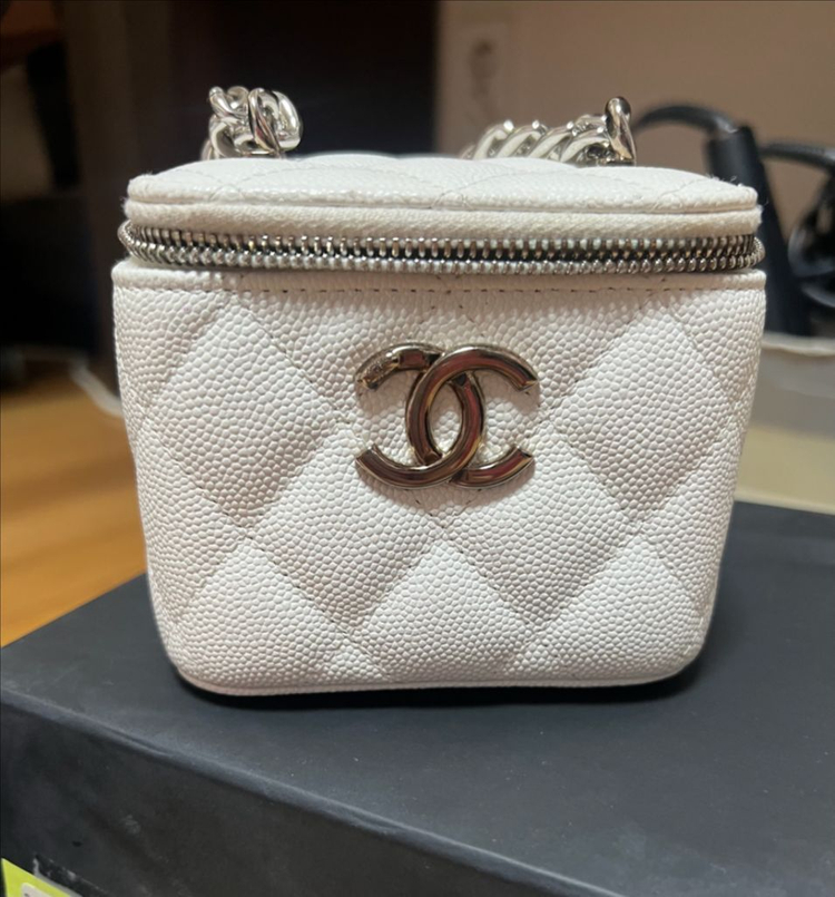 샤넬 베니티 체인백 화이트 캐비어고 체인이 한쪽은 샤넬로고 한쪽은 코코 로고라 가방 메는 방향에 따라 다른 분위기 연출 가능해요!! 뒷판에 이염 있습니다 사진이라 더 적나라하고 실제로 보면 거슬릴 정도 아닙니다!! 정품 맞고 구구스에서 구매해서 더스트백은 구구스입니다! 희소성 있고 사계절 다 예쁜 코코 베니티백 연락주세요
