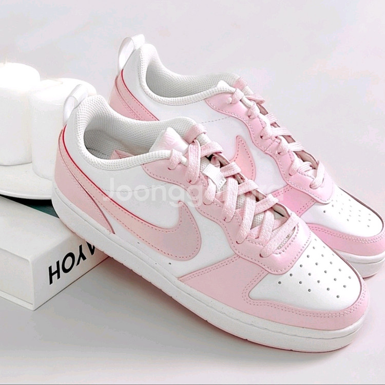 러블리한 느낌의 나이키 코트버로우핑크 색상입니다! 사이즈240이예요 살짝 낙낙하게 나와서 편하게 신기좋습니다^^ 상태는 전체적으로 깨끗한편이예요~(하자,심한오염X)