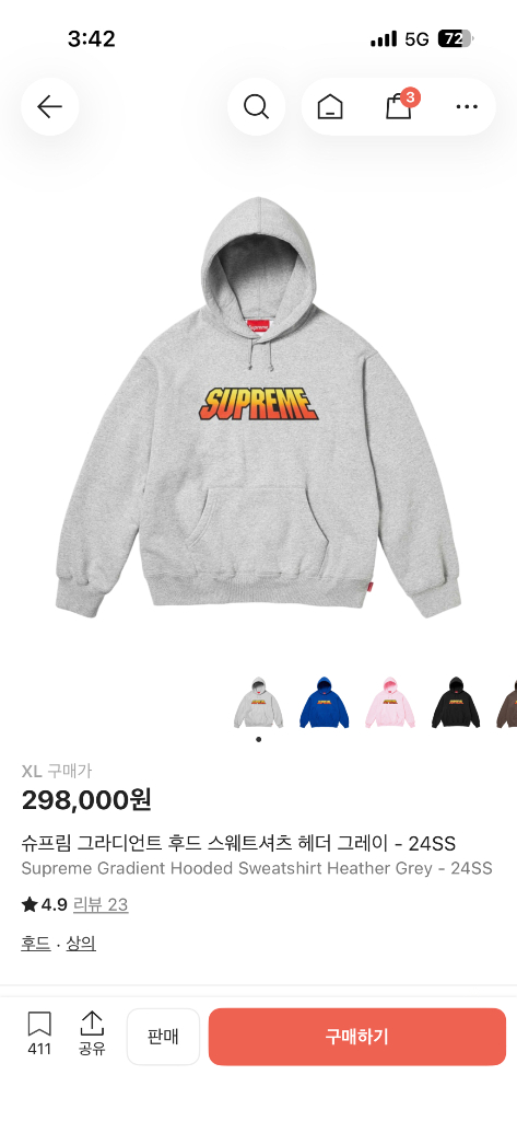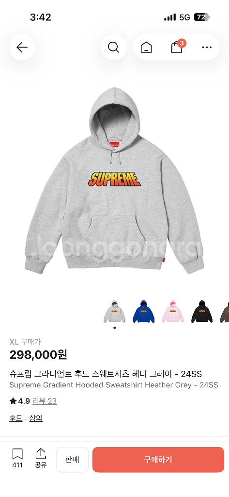 개인정보(거래정보)를 주고받는 행위는 사기에 노출될 수 있으므로 즉시 중고나라로 신고해 주세요슈프림 그라디언트 후드티 XL 사이즈입니다. 깔끔한 그레이 컬러로 어떤 스타일링에도 잘 어울려요. 상태 좋은 제품으로 판매합니다! 구매 : 크림(택o) 사이즈 : 엑스라지 상태 :9/10 가격 : 20 채팅주시면 자세한 사진 보내드려요