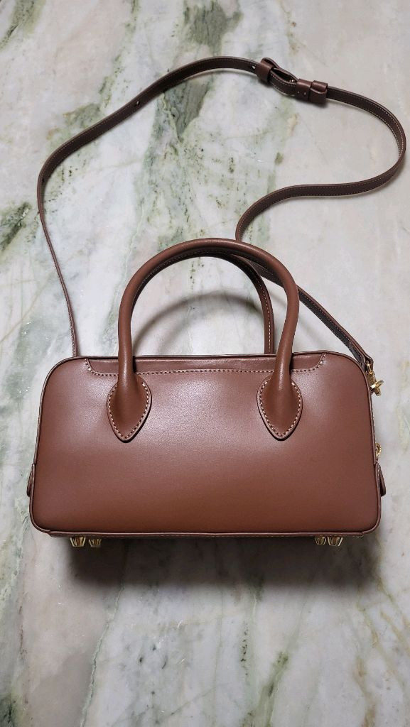 드메리엘 볼링백 미디움 사이즈, 탄 브라운 색상입니다 - 재질은 소가죽입니다 - 무게는 335g입니다 - 가로 22.5cm x 세로 12cm x 폭 8cm입니다 탈부착 가능한 스트랩이 있어 토트백과 숄더백 두 가지 스타일로 연출 가능합니다 세련된 디자인으로 어떤 룩에도 잘 어울립니다. 작은 가방 유행해서 샀는데 저는 보부이라 큰 가방만 들어서 저렴히 팝니다. 지금 모든 사이트에서 23만원 이상 가격으로 판매되고 있어요! 직장인이라 GS 반값 택배만 가능하며 택배비는 제가 부담하겠습니다~♡
