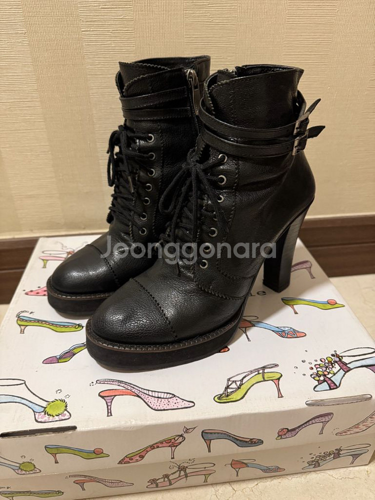 개인정보(거래정보)를 주고받는 행위는 사기에 노출될 수 있으므로 즉시 중고나라로 신고해 주세요블랙 레더 앵클부츠예요. 사이즈 240 끈으로 조여서 착용할 수 있고 굽이 높아서 스타일리시해요. 굽높이 10cm, 앞굽 2cm 예뻐서 샀는데 높아서 많이 못신었어요. 박스도 함께 드려요!