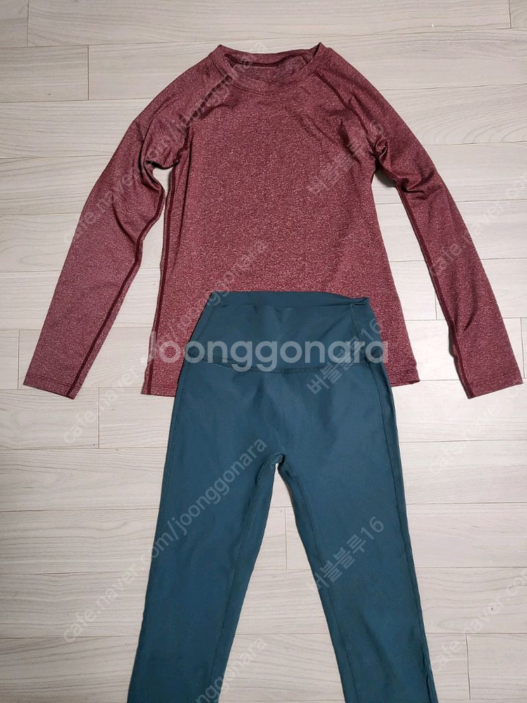 여성용 요가복 상하의 세트예요. 버건디와 청록색 컬러 조합이 예쁘고, 상태도 깔끔합니다 구입하고 1회 착용후 그대로 보관만했어요 상의는 L 66~66반 M사이즈 55~66 (사이즈표 참고바람) 66입는데 요가복이 타이트하게 나와서 상의는 L사이즈로 했었어요 상태 깨끗하고 좋은편이지만 예민하신 분들은 패스해주세요 교환,환불X