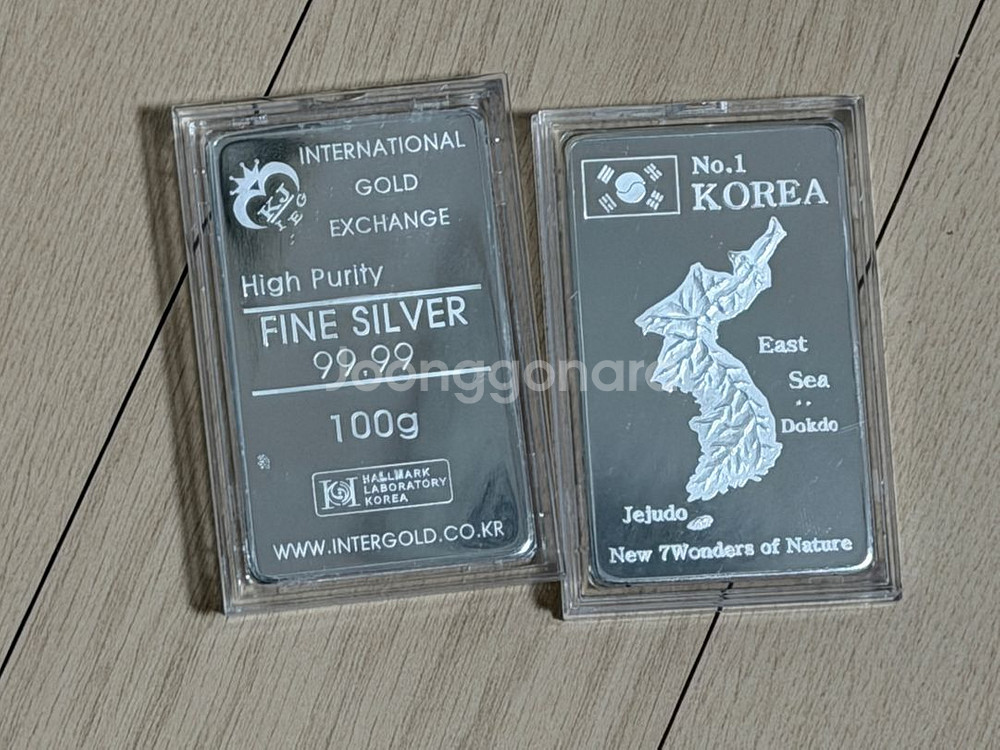 국제금거래소 100g 실버바 (독도실버바/기본실버바) 2개 팝니다 국제금거래소의 독도 디자인, 기본 디자인 두개입니다 총200g이며 개당 65만원 (2개 130만원입니다) 2개 일괄로만 판매합니다. 은값이 폭등 중인데 급전이 급해서 판매합니다 상태 깨끗하며 사진 참고해주세요 직거래는 김포 풍무에서 가능하며 택배거래는 ㄱㅈ거래시 택포 서비스 안심결제시는 택미포+수수료3% 추가됩니다
