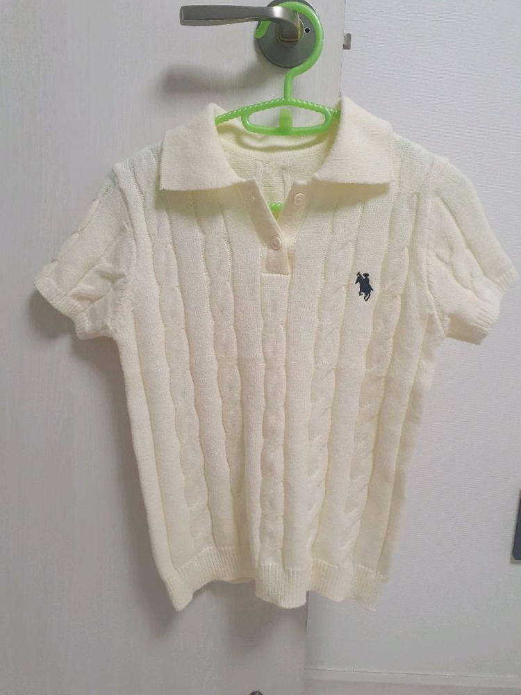 케이블 니트 반팔 셔츠입니다 아이보리 색상이며 구매후 못 입었어요. 케이블 니트 디자인으로 포근하고 고급스러운 느낌을 줍니다 색상은 따뜻하고 예쁜색이예요. 사이즈조언 어려우니 사진상 줄자로 잰 단면사이즈 확인해 주세요.