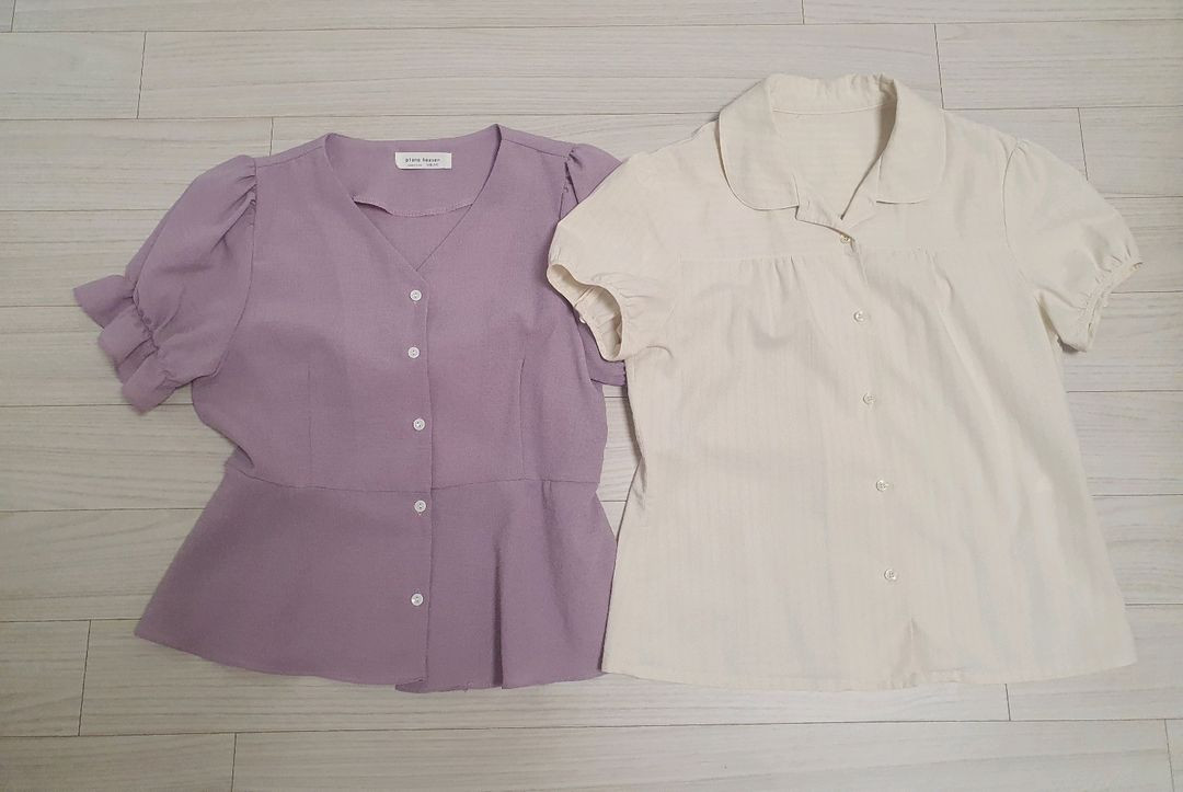 여름에 입기 좋은 블라우스 2벌 세트 일괄입니다 - 라벤더 색상 블라우스와 아이보리 색상 블라우스입니다 사이즈조언 어려우니 사진상 줄자로 잰 단면사이즈 확인해 주세요.