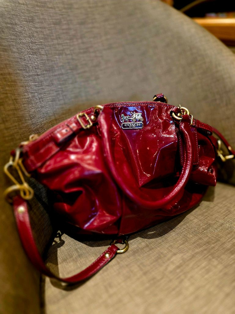 COACH 정품 토트백입니다 고급스러운 버건디 컬러 페이턴트 가죽으로 포인트 주기 좋아요 토트 + 탈부착 스트랩 포함으로 숄더/크로스 착용 가능 연식 있는 빈티지 제품으로 자연스러운 사용감 있음 엣지 있게 들 수 있는 연예인 백 ✔ 찢어짐 없음 ✔ 스냅·버클·지퍼 전부 정상 내부 깨끗한 편, 사용에 문제 없음 사용감 적음, 사진 확대해서 신중히 보세요. 택배 가능 (배송비 별도) 직거래 가능/ 안전거래선호 반품·환불 불가 중고 특성상 예민하신 분은 패스해주세요