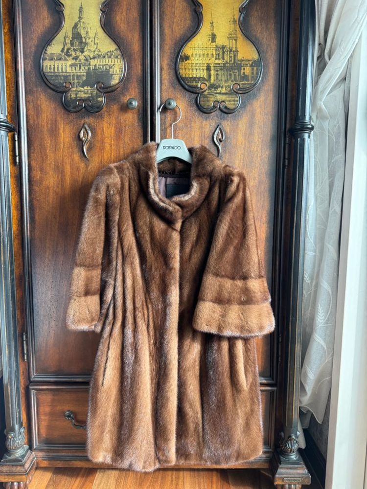 동우 밍크 코트입니다 부드러운 밍크 소재로 고급스러운 느낌을 줍니다 색상은 브라운이며, 벨트가 포함되어 있습니다 상태는 양호합니다