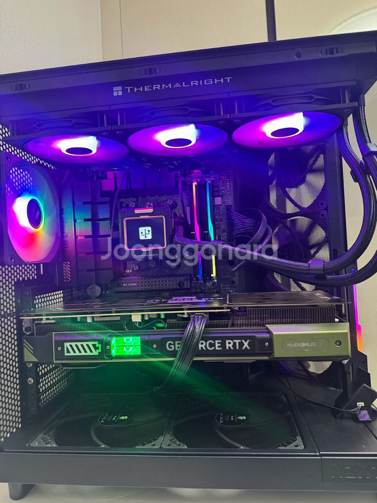 -AMD 라이젠7-5세대 7950X3D -Thermalright FROZEN WARFRAME 360 ARGB 12 (BLACK) -ASUS TUF Gaming B650M-PLUS STCOM -G.SKILL DDR5-5200 CL40 RIPJAWS M5 RGB 블랙 패키지 (64GB(32Gx2)) -MANLI RTX 4080 SUPER Gallardo D6X 16GB 대원씨티에스 -HP EX950 M.2 NVMe (2TB) -NZXT H6 Flow (매트 블랙) -AONE 시그니처 1000W 80PLUS브론즈 풀모듈러 ATX3.1 -win11 정품인증 24년 7월 구매했습니다. 흡연, 채굴없이 깨끗하게 사용했고 포맷했습니다! 부품 모두 중고급 이상으로 조립했고 약간의 먼지 외에 상태 좋습니다. 박스는 시피유, 보드, 메모리, SSD, 그래픽카드(겉박스만) 보유 중입니다. 궁금한 부분은 문의주세요! 직거래 시흥 목감