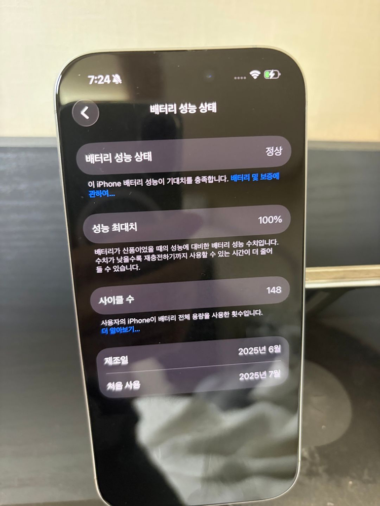 아이폰16프로 화이트티타늄 256G 판매합니다. 2025년 6월 제조, 7월부터 약 6개월 사용했고 케이스 씌워서 사용해서 상태 A급입니다. 배터리 사이클 148회, 효율 100%이며 찍힘이나 긁힘 등 흠집 없습니다. 정품박스 및 구성품 같이 드리며 정상해지 폰입니다.