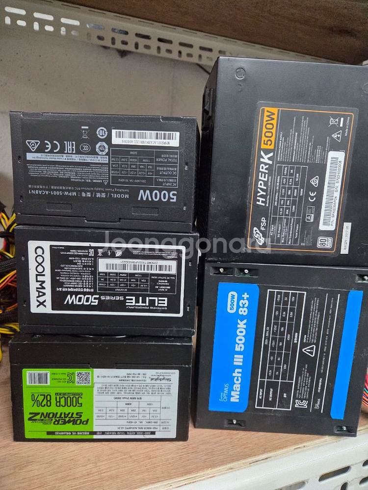 다양한 브랜드의 500W 파워 서플라이를 판매합니다 - FSP Hyper K 500W - COOLMAX Elite Series 500W - SkyDigital Power Station2 500CR 82+ - Smart OPTIMUS Mach III 500K 83+ - Master Cooler MPW-5001-ACABN1 전반적으로 상태는 양호합니다 개당금액 필요하신거 선택하세요