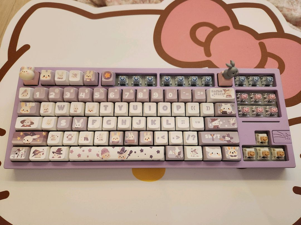 귀여운 마법사 토끼 키캡이 장착된 풀알루 보라색 키보드에요. 중간에 포인트로 쿠로미 키캡을 끼워놧구여, 스위치들은 전부 저소음 택타일축으로 압력은 40~43 왓다갓다 거릴꺼에용 무겁지도 가볍지도 않구 쫌 쫀쫀한 느낌?이에여 실사용은 10일정도고 보관만 주구장창 햇는데 스테빌라이저쪽들이 쫌 찰찰거리네요ㅠㅠ 그것말고는 사용하는데 지장없습니당 !!