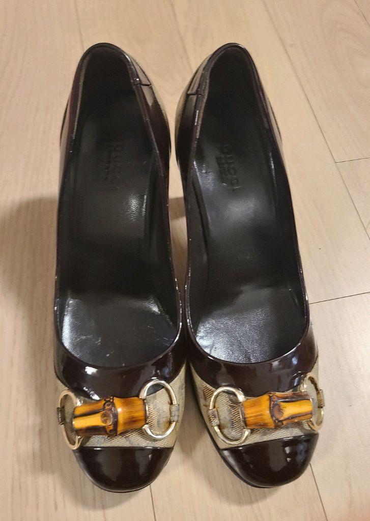 [정품] 구찌 여성 밤부 힐 사이즈는 37C/240 8cm 굽높이 (여유굽 있음) 구찌 시그니처 팬더 장식이 포인트인 블랙 레더 구두예요. 상태 양호하고 고급스러운 디자인이 매력적이에요.