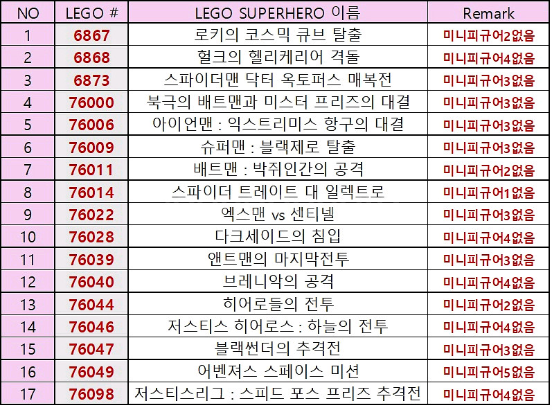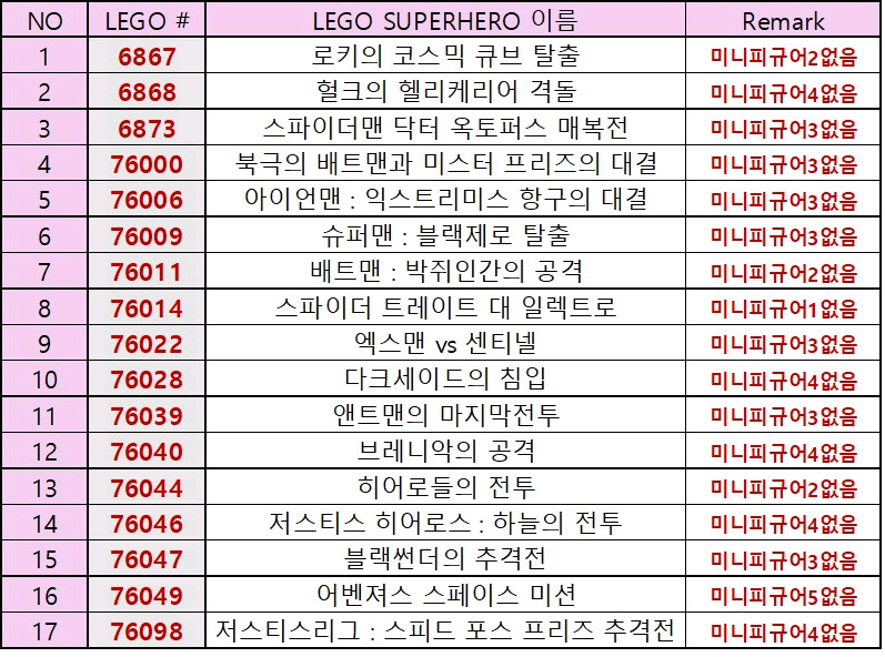 오랫동안 수집했던 레고 슈퍼히어로 시리즈 17종을 일괄 판매합니다 제가 레고 상자내에 미니피규어를 수집한바..피규어는 제외하였습니다 또한. 오랫동안 박스에 보관했지만 일부 블릑은 분실되어 있을수도 있습니다(대부분 내부 비닐 있음)) 크기는 이삿짐 종이상자 430X370X610cm 상자로 포장했습니다 직거래 원하나 CJ택배등으로 착불 가능합니다 직거래 장소는 인천 연수구 송도내 예송중학교 근처입니다 주중 7시이후 주말 오전 10시이후 가능합니다 매입금액은 구입당시 100만원정도이나 피규어인형을 제외하기에 5만원으로 정했습니다. (배송비제외)...착한가격에 내놓는대신 블록분실물에 대한 크레임은 생각하지 않습니다 O1O-7146-6823으로 문자주세요