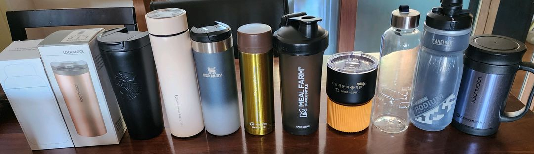 다양한 텀블러와 머그컵 모음입니다 일괄 구매 시 네고 가능합니다 스타벅스 텀블러 2만 스탠리 텀블러 1.5만(뒤쪽에 응원 문구 있습니다) 락앤락 새상품 1만 머그컵 3개 세트 1.5만 그 외 텀블러 5천