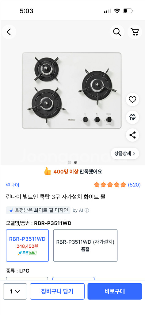 깔끔한 화이트 컬러의 빌트인 3구 가스레인지예요. LPG용으로 되어있고 상태 양호합니다. 주방에 잘 어울리는 심플한 디자인이에요.