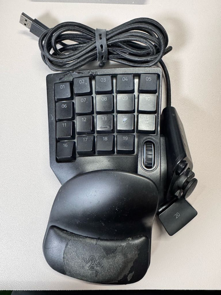 레이저 타르타로스 V2 한손 매크로 키보드입니다. 저는 작업용으로 사용했습니다 사진에서 보시다시피 사용감이 많이 있고 약간의 외관 파손도 있습니다. (사진 참고) 기능에는 전혀 이상이 없지만 외관에 예민하신분은 참고 부탁드립니다.