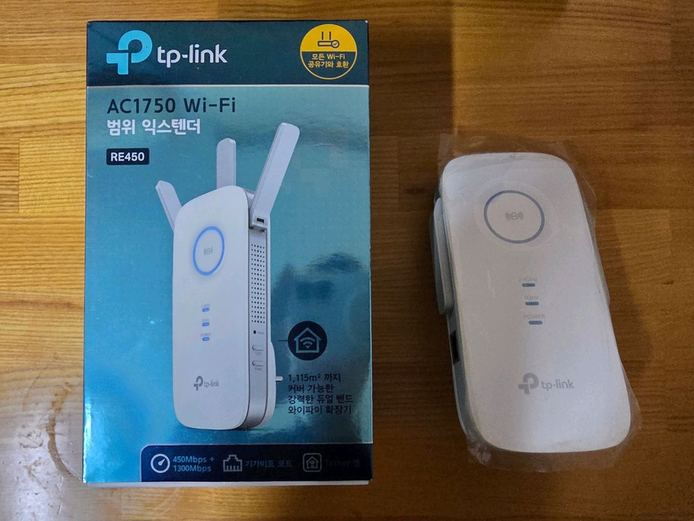티피링크 RE450 Wi-Fi 공유기예요. 박스와 본체 모두 깨끗한 상태로 잘 보관되어 있습니다. 빠른 인터넷 속도를 원하시는 분께 추천드려요!