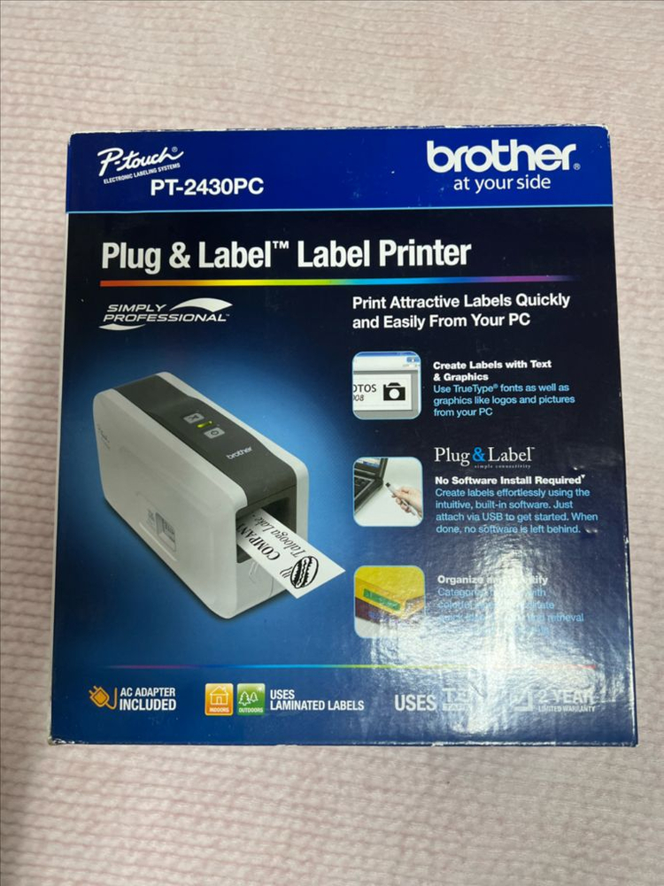 PC에 간편하게 연결해서 사용할 수 있는 라벨 프린터예요. 새 제품 상태로 포장도 깨끗하고 미개봉 상품입니다. 미개봉 브라더 PT-2430PC 라벨 프린터입니다. PC에 연결해서 텍스트나 로고, 사진으로 라벨을 만들 수 있습니다. 윈도우, MAC 둘 다 호환되고, AA 건전지 또는 AC 어댑터로 전원 공급 가능합니다. 아예 새제품이고 인증 가능합니다
