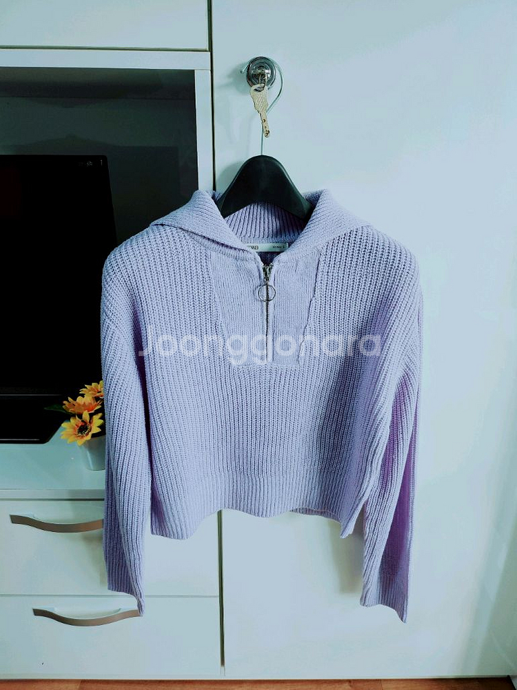 예쁜 퍼플 컬러의 니트 후드 집업이에요. 한번 착용해 거의 새거 크롭 니트 색감 너무 이뻐요 사이즈 S 환불 x 반값택배 가능