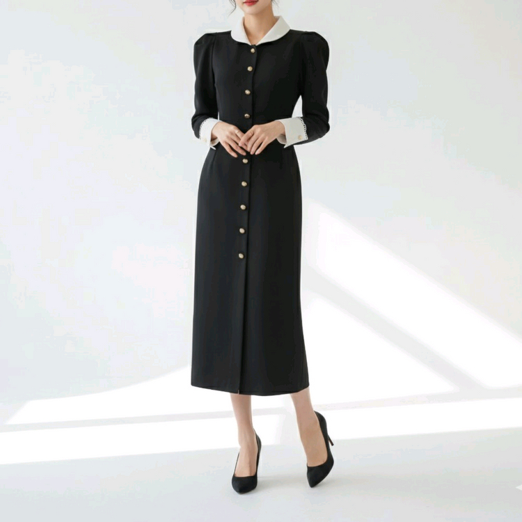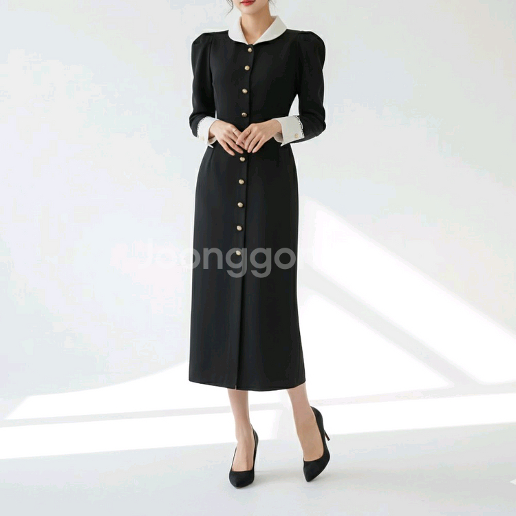 단정함 속의 우아함, 고급스러운 실루엣이 돋보이는 카라 버튼 롱원피스 소개드려요 흰색 카라와 소매 배색 디테일로 포인트를 주었고, 버튼 라인이 전체적으로 길게 이어져 슬림하고 길어보이는 라인을 연출해 줍니다. 어깨 퍼프 디자인으로 여성스러움과 클래식함을 더했어요. 봄, 가을, 초겨울까지 착용 가능한 두께감으로 격식 있는 자리나 데일리룩 모두 잘 어울립니다. ♡ DETAIL INFO 색상 : 블랙 (화이트 배색 카라 & 소매) 소재 : 폴리 80%, 레이온 20% 원산지 : 대한민국 계절감 : 봄 / 가을 / 겨울 두께감 : 보통 신축성 : 없음 비침 : 없음 안감 : 있음 * 사이즈 정보 (cm 기준) 사이즈 : 총장, 어깨, 가슴 ,소매, 허리 ,힙 M 129, 33, 48, 64 ,38, 42 L 130, 34 ,52, 65 ,40, 44 *측정 위치나 방법에 따라 ±1~3cm 오차가 있을 수 있습니다. *POINT ✔ 고급스러운 버튼 디테일 ✔ 흰색 카라 & 소매로 클래식한 포인트 ✔ 퍼프 어깨로 여성스러운 실루엣 ✔ 안감 있음, 비침 걱정 없이 착용 가능 ✔ 격식룩 / 오피스룩 / 하객룩 / 데이트룩 추천