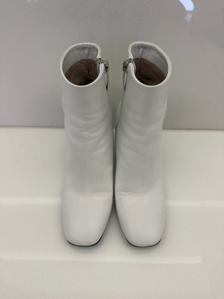 슈콤마보니 앵클부츠 230 사이즈 입니다. 화이트컬러에 뒷라인이 큐빅으로 포인트 장식 되어 있고, 안쪽 옆라인 지퍼로 신고벗기 편합니다. 굽은 7cm 입니다. 신은 횟수는 몇번 안되어 깨끗한편이지만 화이트 색상이다보니 가죽에 생활기스가 몇군데 있습니다. 밑창 컨디션도 사진으로 확인해주세요.