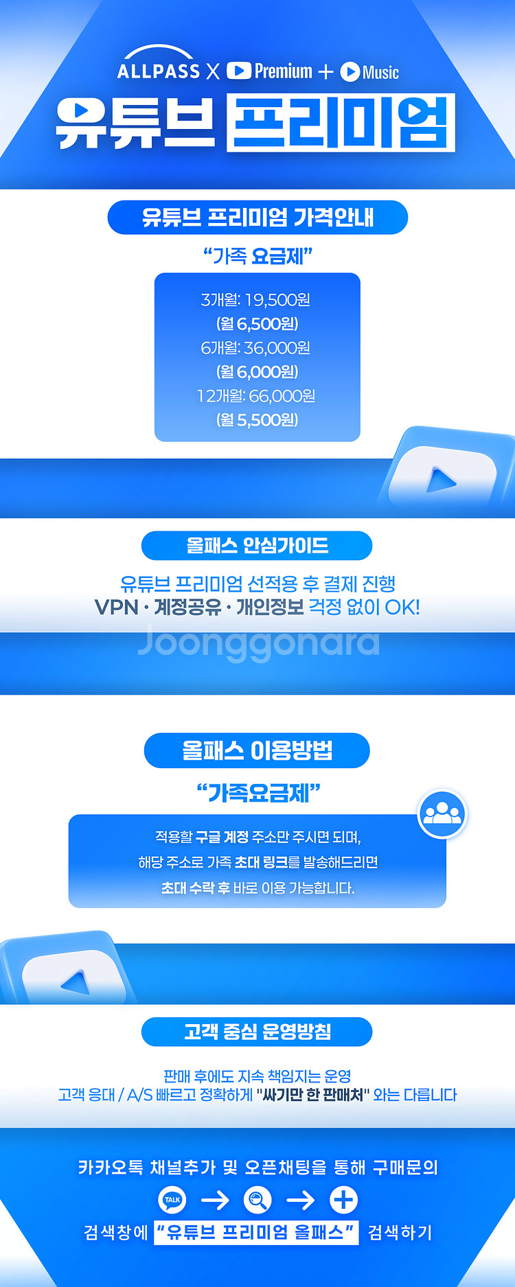 유튜브 프리미엄+뮤직 판매 후에도 계속 책임지는 운영! 고객 응대, A/S 빠르고 정확하게 “저렴하기만 한” 판매처와는 다릅니다 구매 문의는 게시된 이미지 '하단' 참고 부탁드립니다! 깨톡: 유튜브 프리미엄 올패스 검색하셔도 ㅋrㅋr오 채널 나옵니다! 고민 되시는분들 꼭 채널 오셔서 후기 보고 판단하세요! 가족요금제 3개월: 19,500원 6개월: 36,000원 12개월: 66,000원