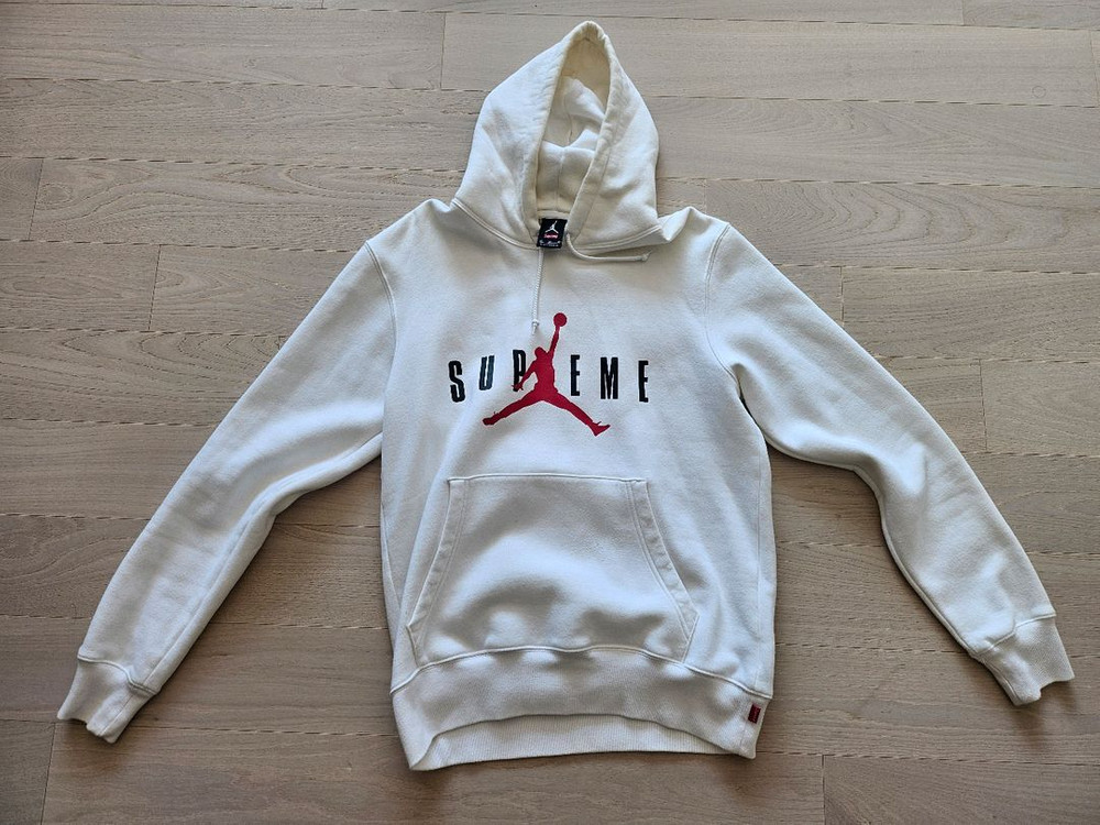 슈프림과 조던의 콜라보 후드티 화이트 상태좋은 중고 제품입니다. 구입후 한번 착용, 세탁후 쭉 보관만 한 제품 입니다. 사이즈는 미국 M 입니다. 당연히 정품입니다. 가품은 사지도, 팔지도 않습니다.