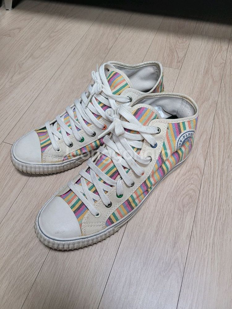 PF flyers 남자 레인보우 캔버스스니커 280(44) 하이입니다 사이즈는 EUR44 US10 UK9.5 KR280정도 입니다 컬러감이 좋고 약간 밋밋해보일수있는 바지에도 포인트 주기 좋습니다 아일렛에도 컬러포인트가 들어가 있어서 신발끈도 컬러로 바꿔도 잘 어울립니다 다른브랜드 스니커와 다르게 깔창이두터워서 쿠션감있습니다 잘 보관하던 것이라서 상태 좋습니다 연락주세요