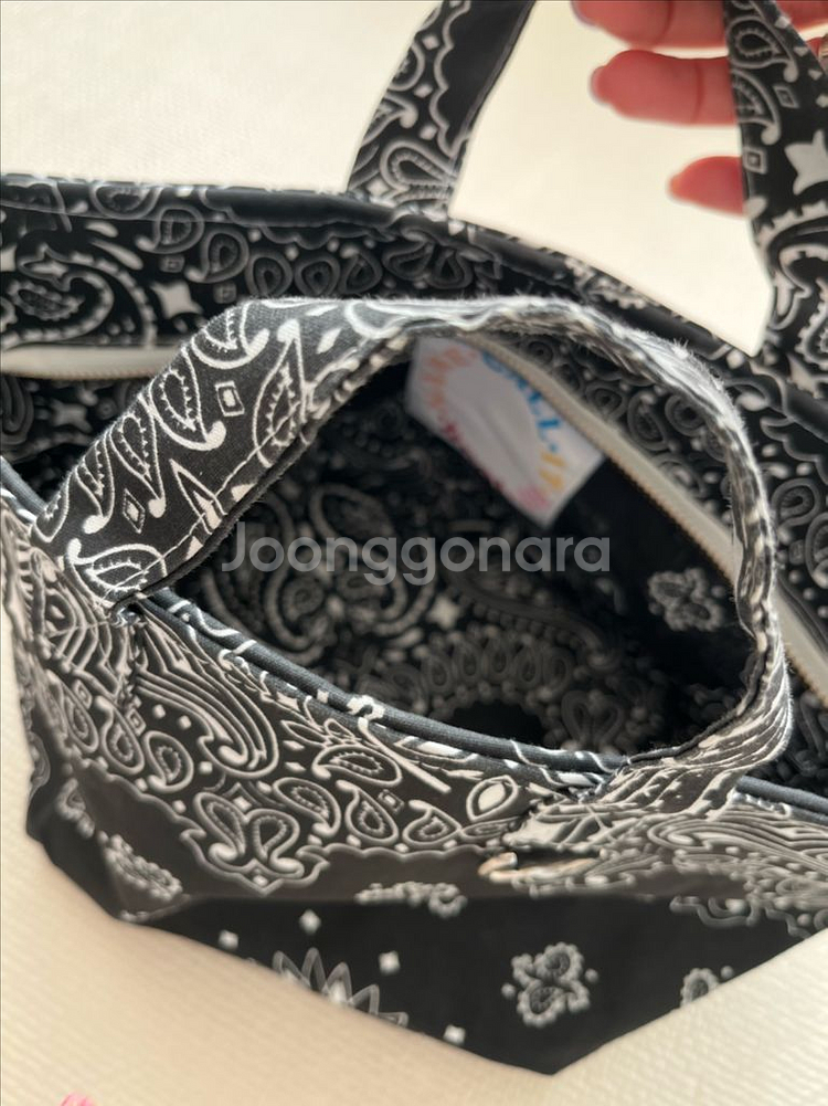 블랙 바탕에 화이트 페이즐리 패턴이 들어간 토트백이에요. 손잡이가 있어서 휴대하기 편하고 실용적인 사이즈입니다. 상태 양호한 중고 제품으로 깔끔하게 사용하실 수 있어요. 3회정도 들었아요 신세계강님점 쏘솔트에서 구매햇어요