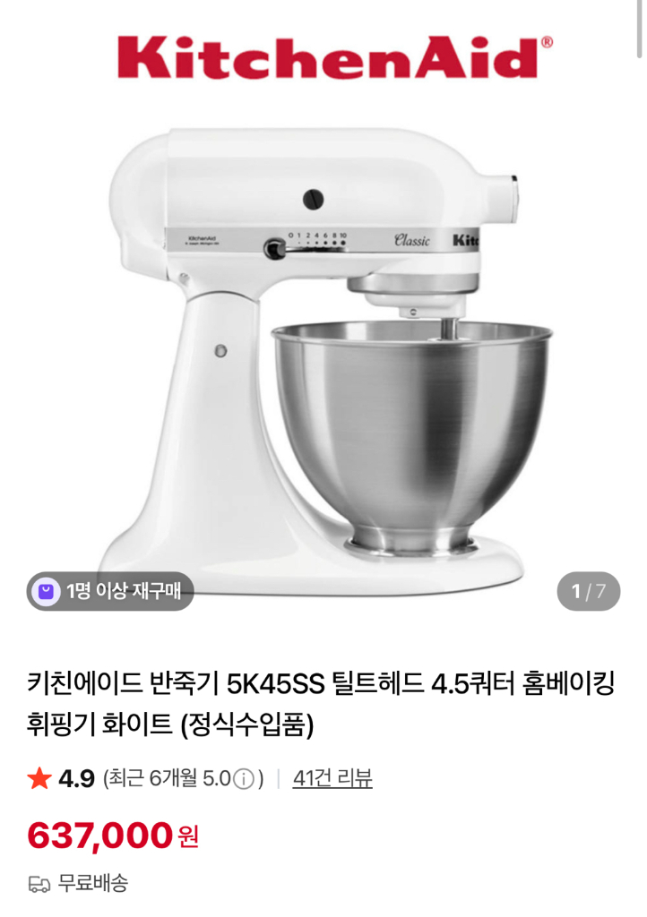 4.5쿼터 틸트헤드 방식 10단 단계별 속도조절 위생적이고 내구성이 강한 스테인레스 스틸 믹싱 볼 어태치먼트 파워허브 본 상품은 4.5쿼터 (4.3L) 용량 틸트헤드 방식 스탠드 믹서입니다. 키친에이드 공식 수입 제품 으로 국내 220V / 60Hz 를 지원하며 정식 A/S 를 받으실 수 있습니다 한번 사용했고 더 큰 사이즈가 필요해 판매합니다
