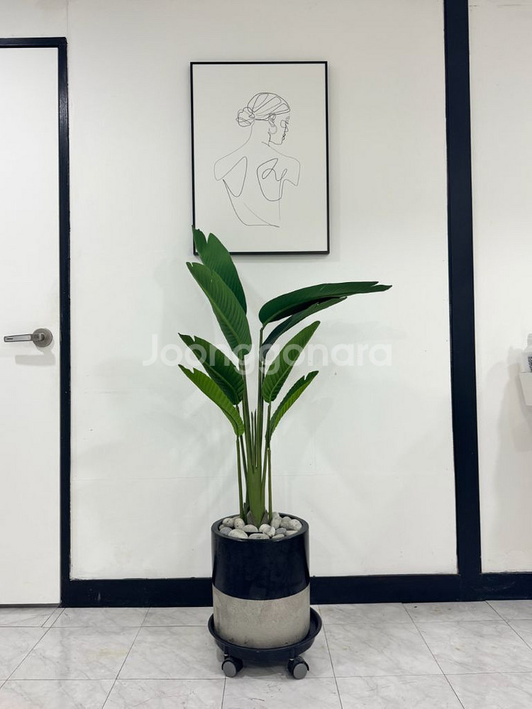 블랙과 베이지 투톤 화분에 담겨있고 바퀴가 달려있어서 이동도 편리해요. 실내 인테리어용으로 좋은 극락조 화분입니다