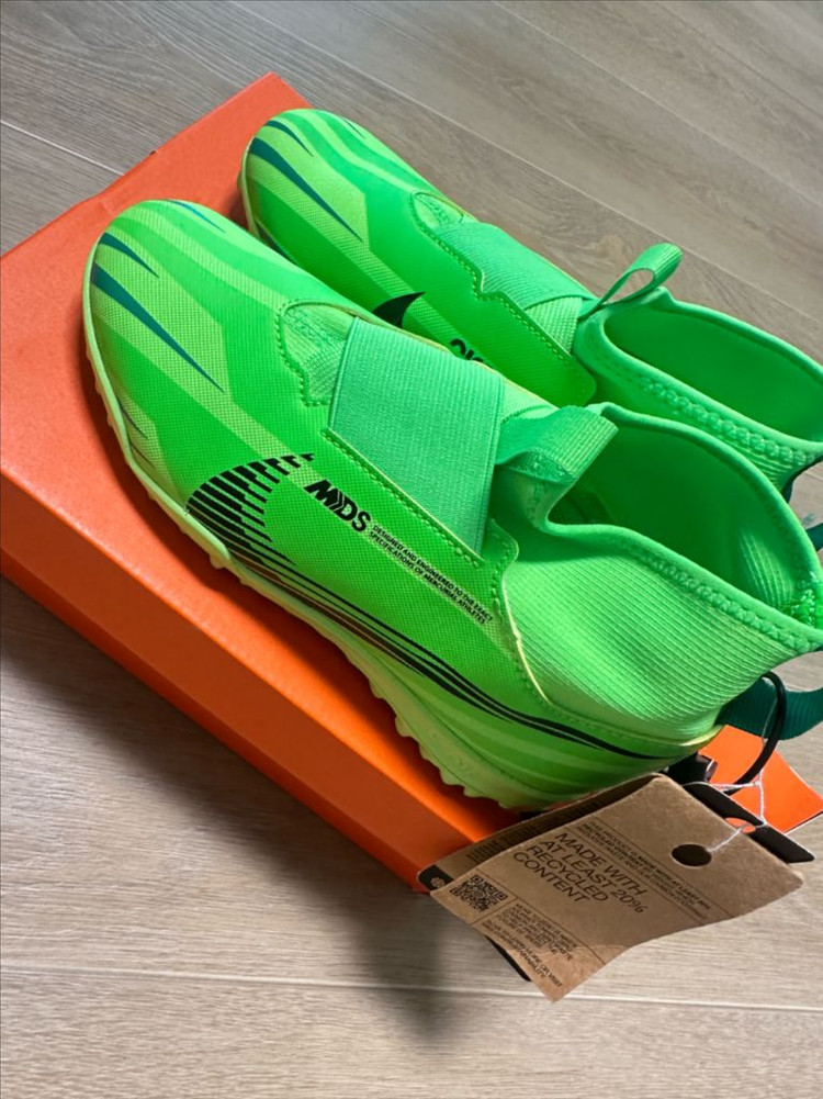 나이키 JR 줌 슈퍼플라이 9 아카데미 MDS TF 풋살화입니다. 그린 스트라이크 색상이며, 사이즈는 225mm입니다 새 제품이며, 박스 포함입니다. 2025 11월쯤 크림으로 구매했습니다. - 가볍고 민첩한 움직임에 최적화되어 있습니다 - 접지력이 우수합니다 - Mercurial Athletes를 위해 설계되었습니다 #축구화 #풋살화 #줌슈퍼플라이
