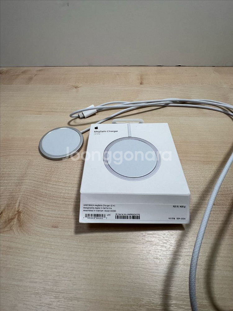 정품 맥세이프 충전기로 2미터 길이의 케이블이 포함되어 있어요. 박스와 구성품이 모두 깔끔하게 보관되어 있고 상태 양호합니다. 스마트폰 무선충전용으로 사용하시면 됩니다. 보조 책상 위에 두고 아주 가끔 사용했습니다. 사용감 거의 없는 새것입니다. 2m되는 길이 때문에 전원부랑 거리가 멀어도 넉넉히 설치가 가능해요.