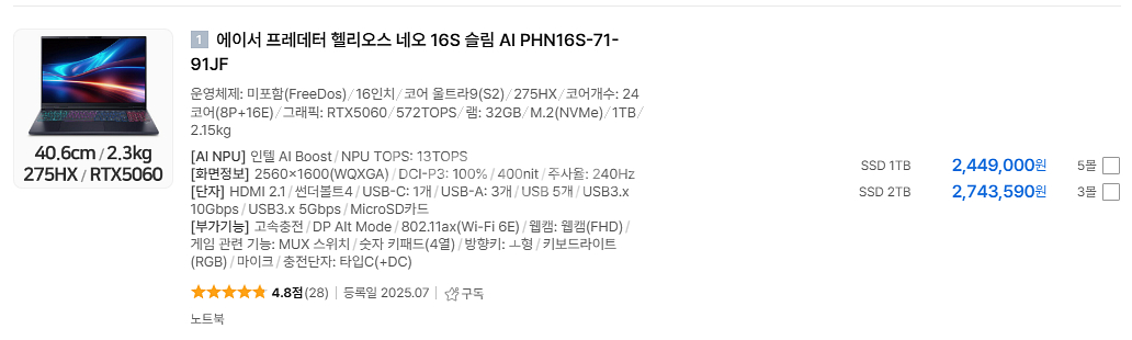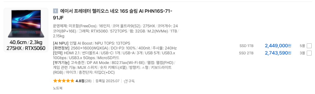 세계 최강 CPU 노트북 - 코어울트라9 (S2) 275HX 코어 울트라9(S2), 노트북 최강 하이앤드 275HX 인텔 CPU RTX 5060, 램 32G, SSD 1TB 인터넷 최저가 245만원인데, 195만원에 팝니다. 에누리 가격비고 사이트 https://www.enuri.com/detail.jsp?modelno=136044759 ㅡㅡㅡㅡㅡㅡㅡㅡ 에이서 프레데터 헬리오스 네오 16S 슬림 AI PHN16S-71-91JF 운영체제: 미포함(FreeDos)|16인치| 코어 울트라9(S2)|275HX|코어개수: 24코어(8P+16E)| 그래픽: RTX5060|572TOPS|램: 32GB|M.2(NVMe)|1TB|2.15kg ㅡㅡㅡㅡㅡㅡ 미개봉 새제품입니다. 네고는 차단합니다.