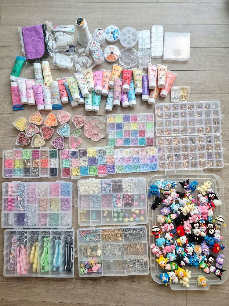 다양한 캐릭터와 다양한 종류의 비즈와 악세사리 부자재 세트 일괄 판매해요. 여러 색상과 모양의 비즈, 데코덴파츠, 지비츠재료, 팬던트, 데코덴 크림재료, 키링 부자재 등이 포함되어 있습니다 파츠가격만 50만원 넘게 들었습니다 진짜 저렴하게 드립니다~~~ 서비스로 사진외 파츠나 다른재료 더 챙겨드립니다 배송비포함 / 교환환불❌